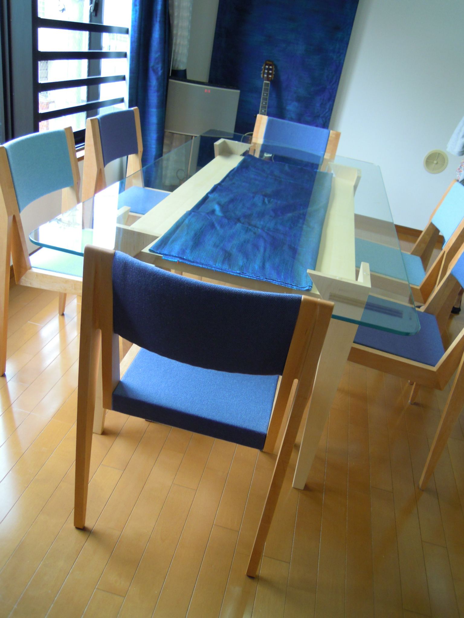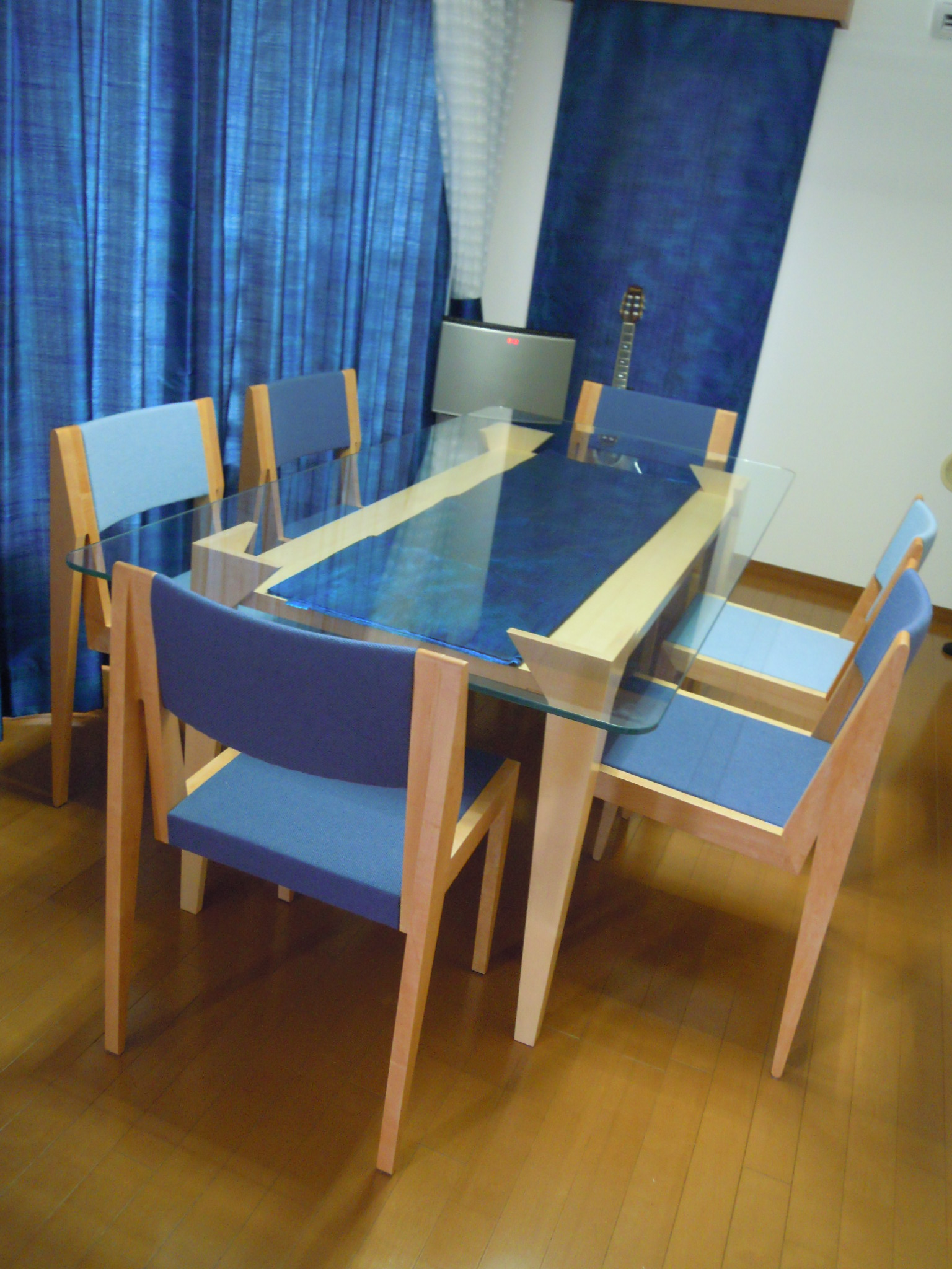 新たな住居で、ガラス天板を使ったオリジナルな家具とベッドまわり一式のコーディネートを