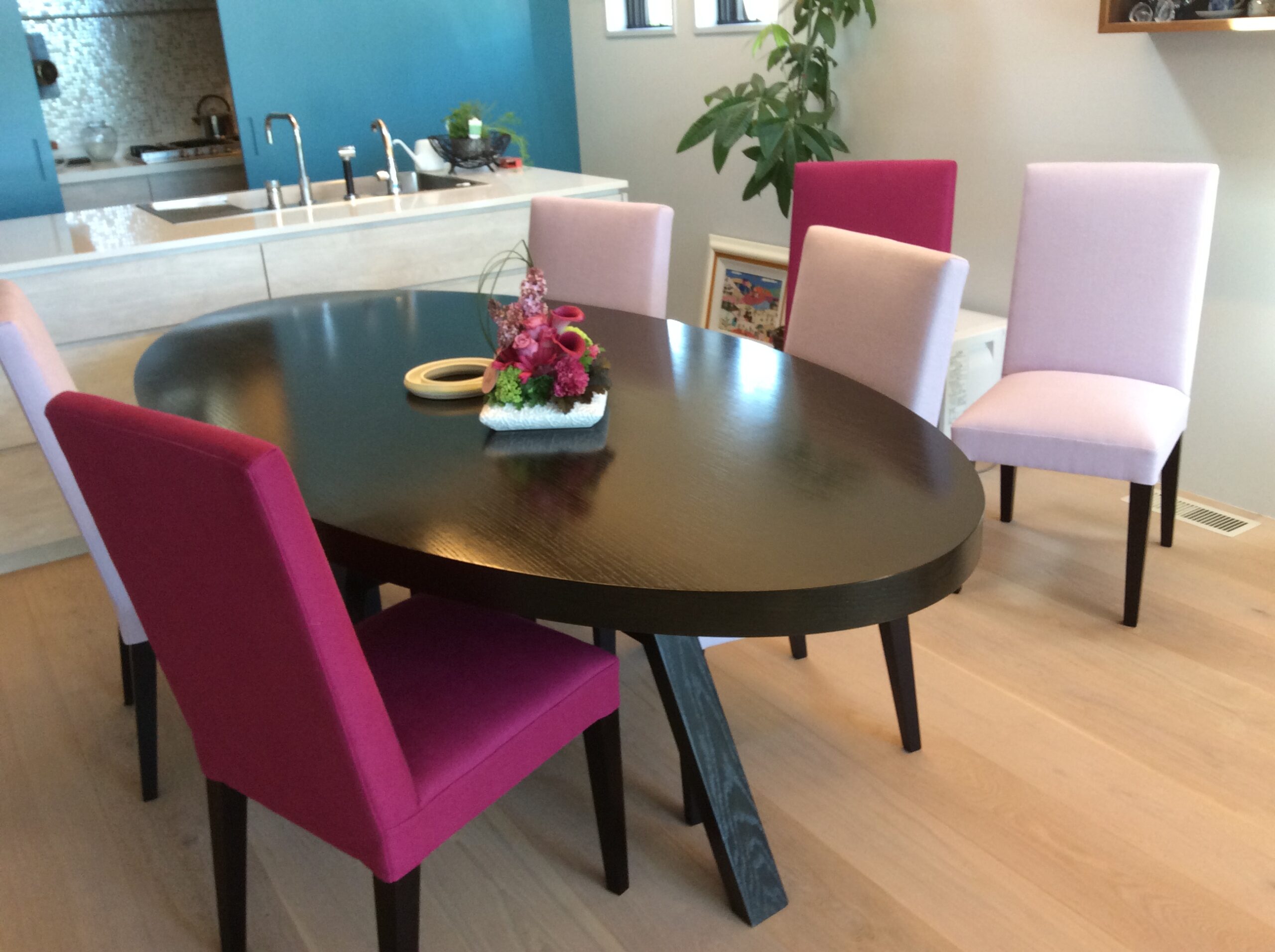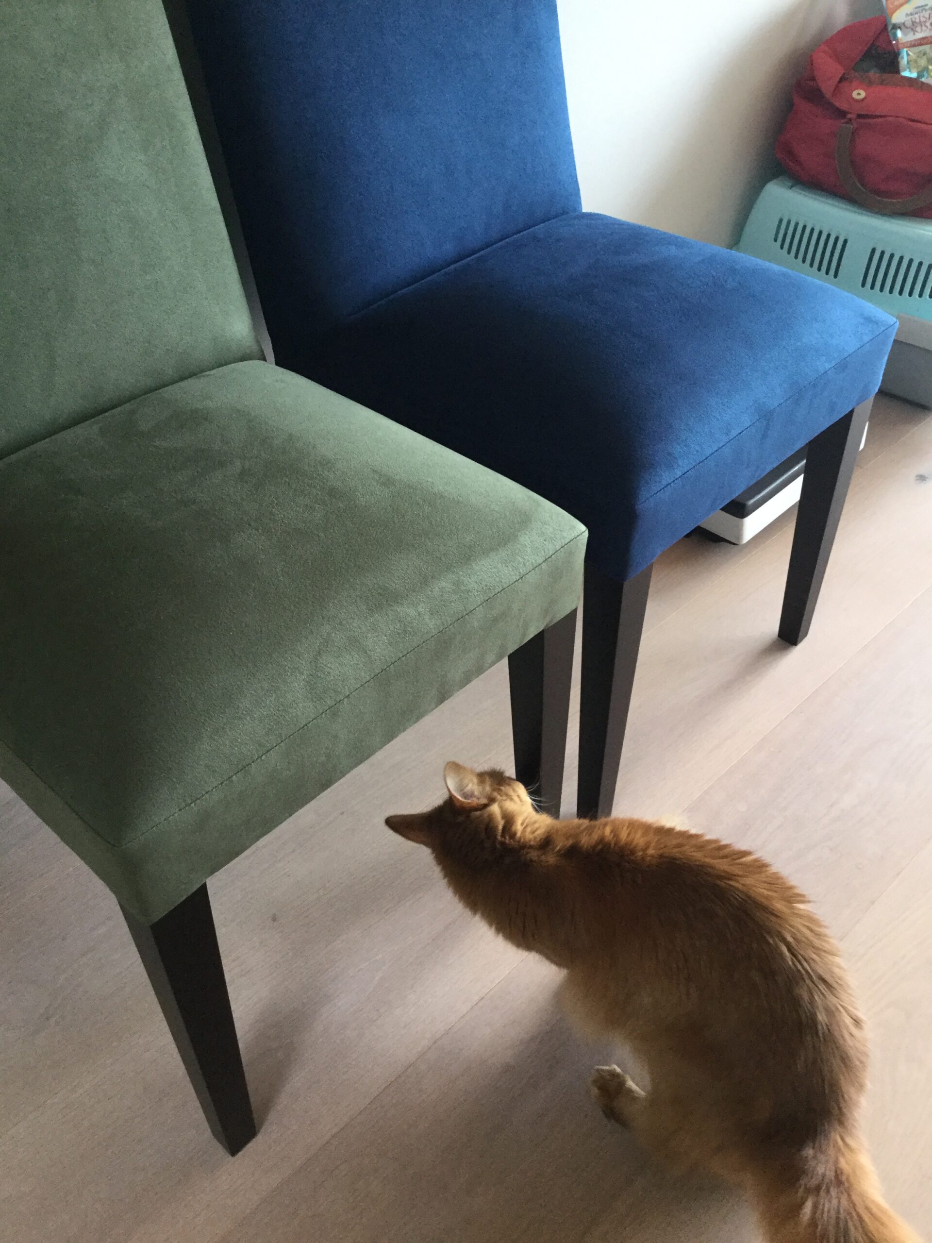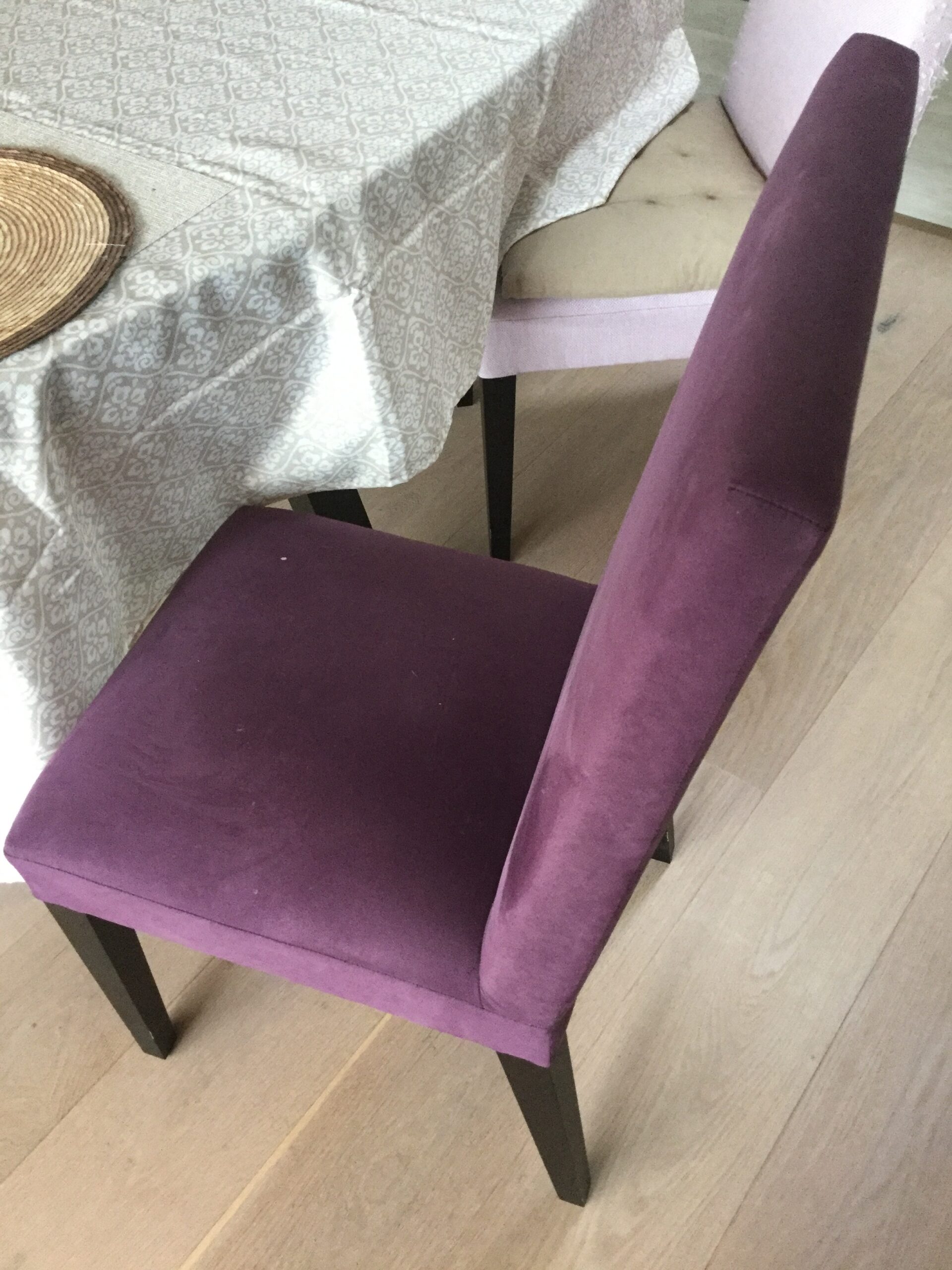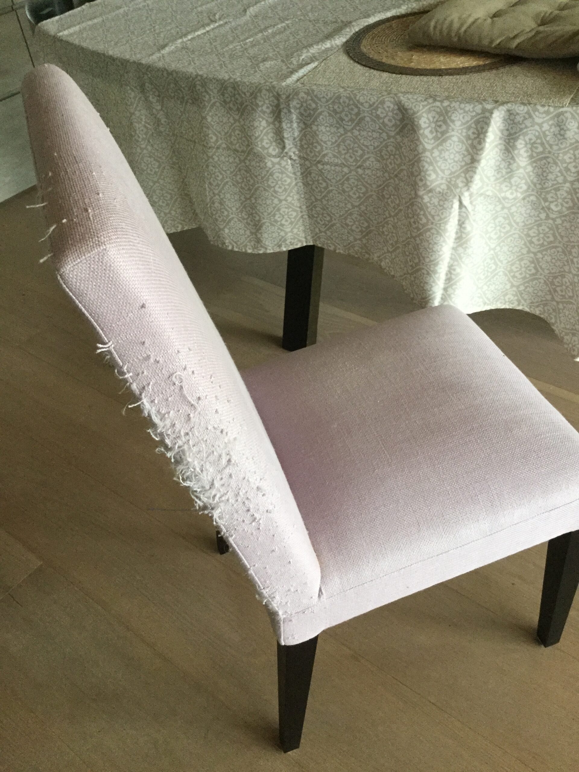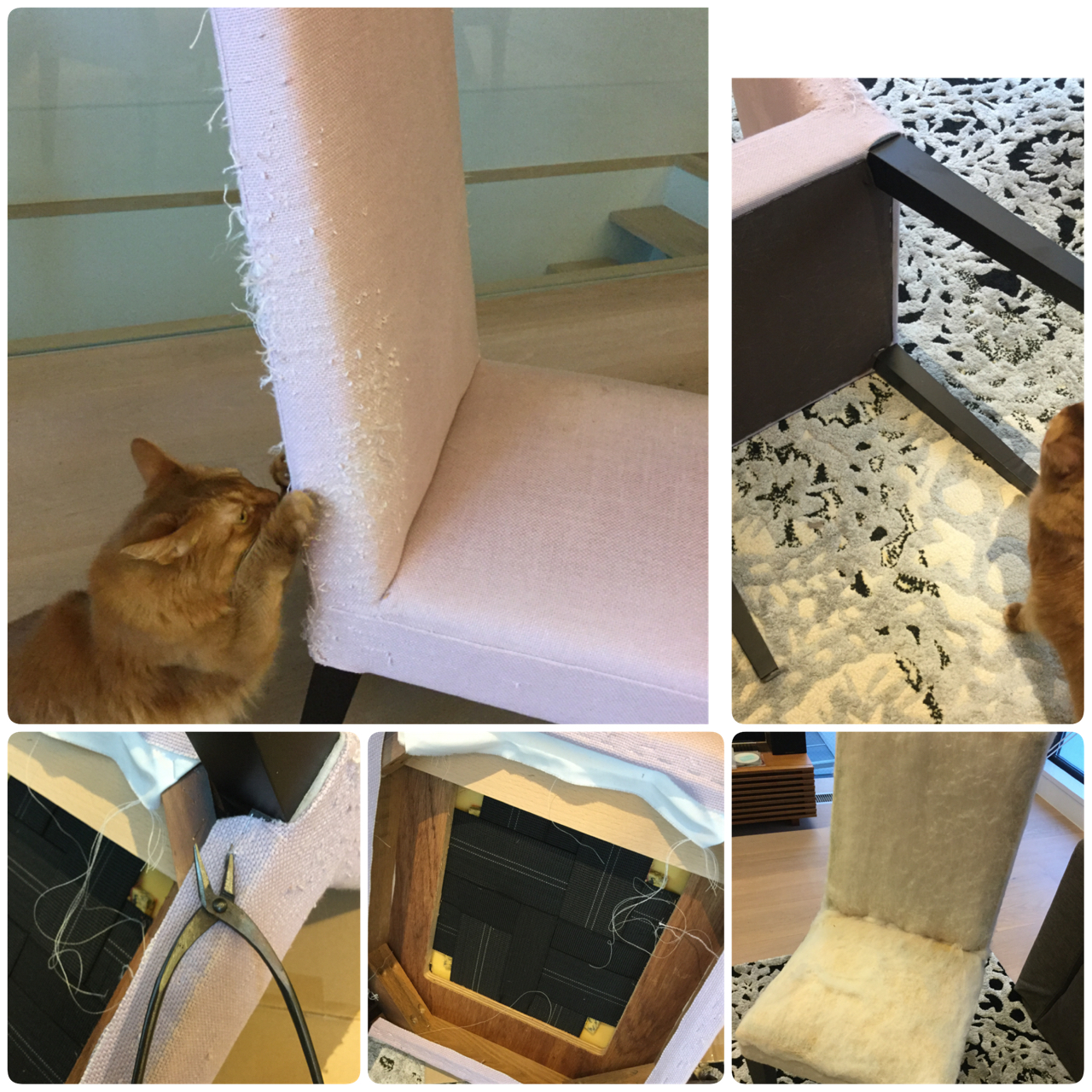 ■猫に引っかかれてボロボロになったダイニングチェアを、ひっかきに強いラムースという生地に張り替えました。