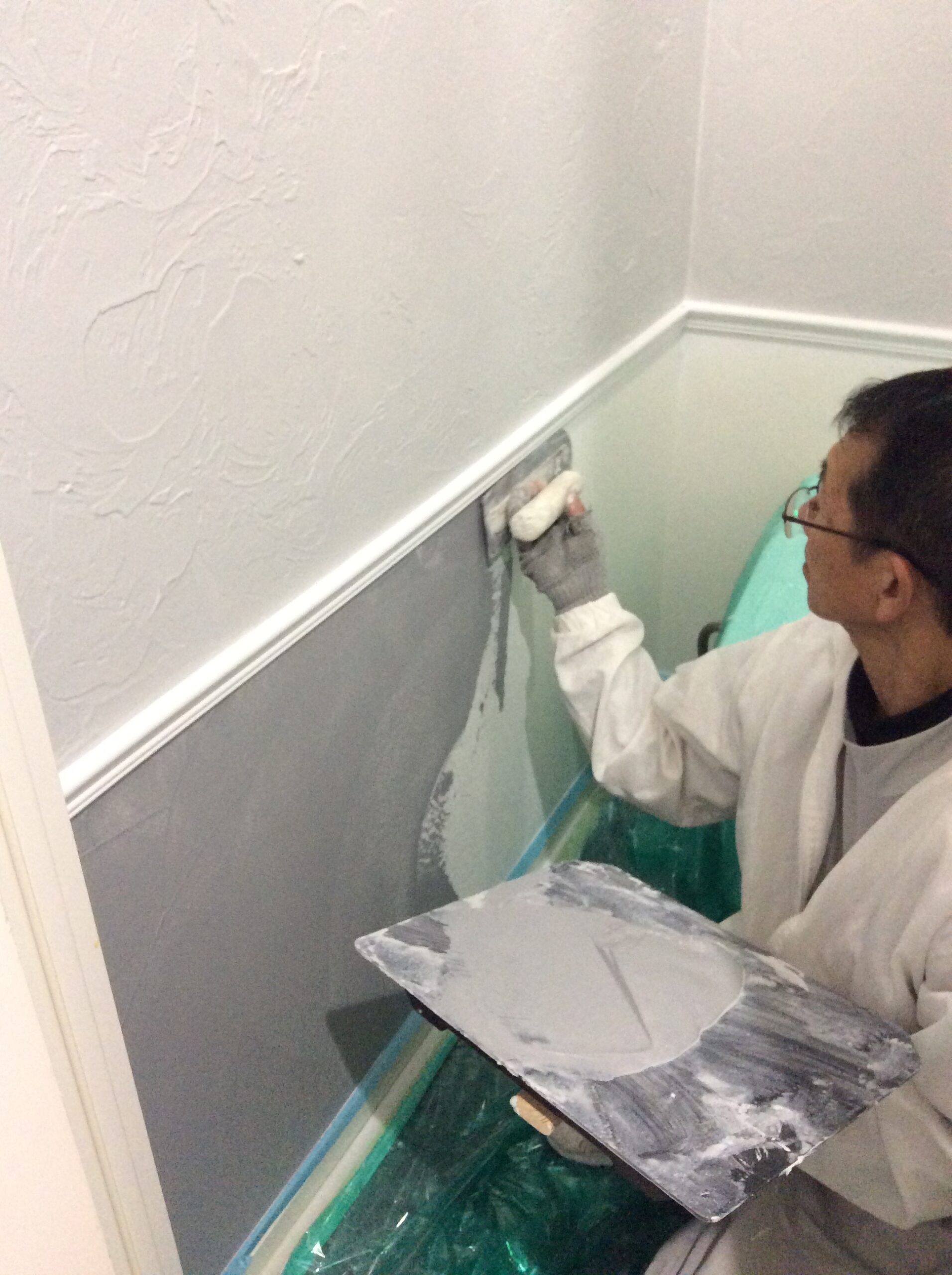 モールディングを使用し、壁はグレー系で上下ツートンで塗装、床もシックな塩ビタイルに張り替えました。