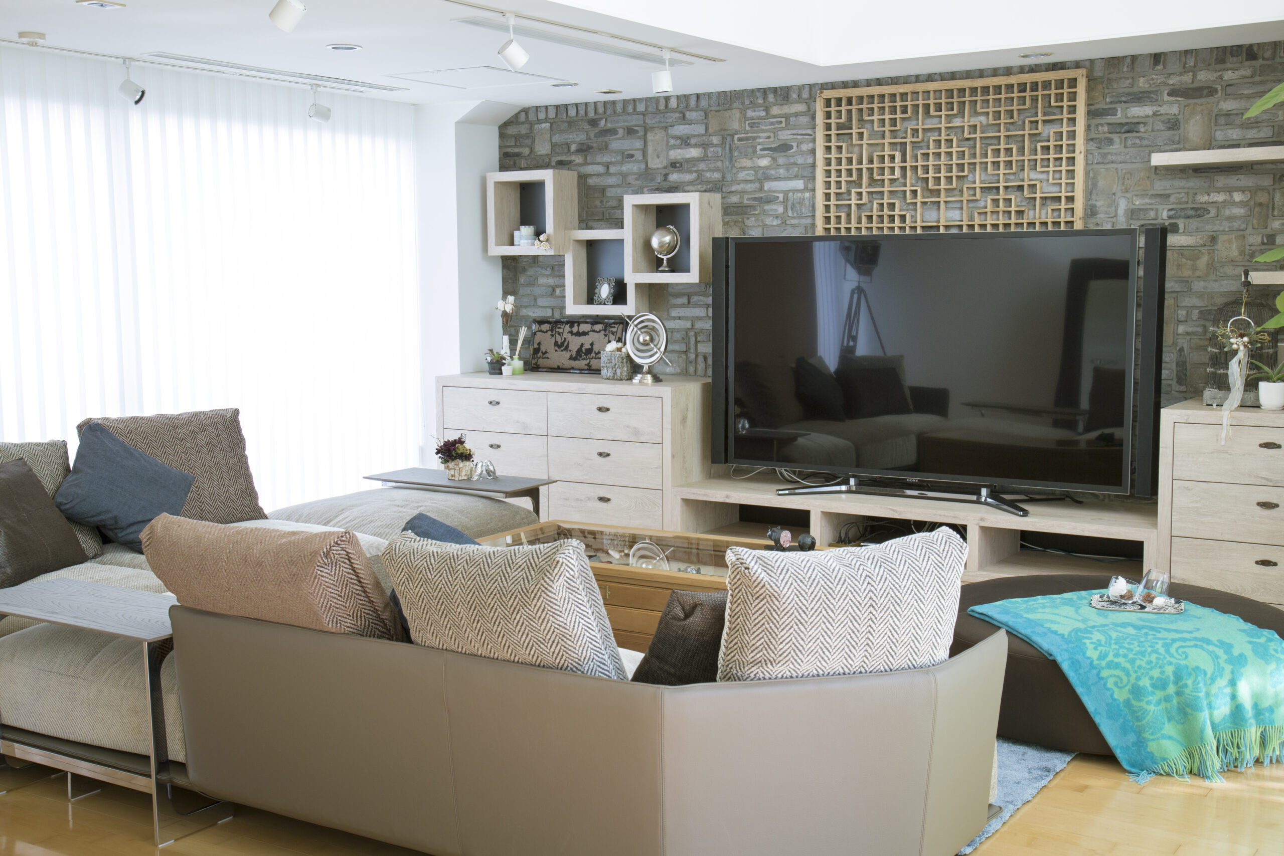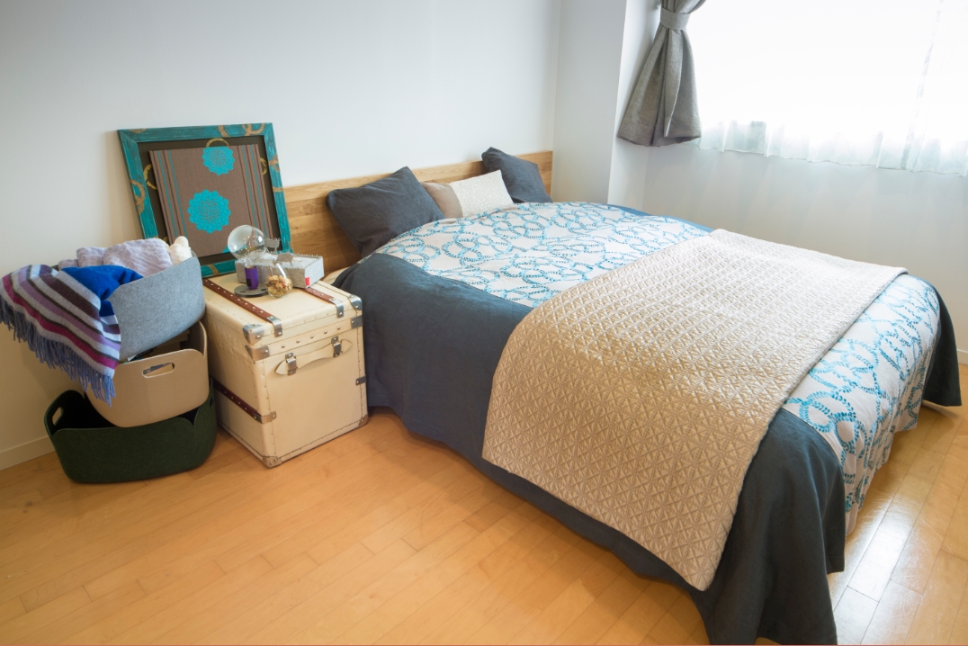 ■インテリア:ソファ(アルフレックス)、テーブル、ベッド(日本ベッド)、オーダーベッドスローやクッション一式、
